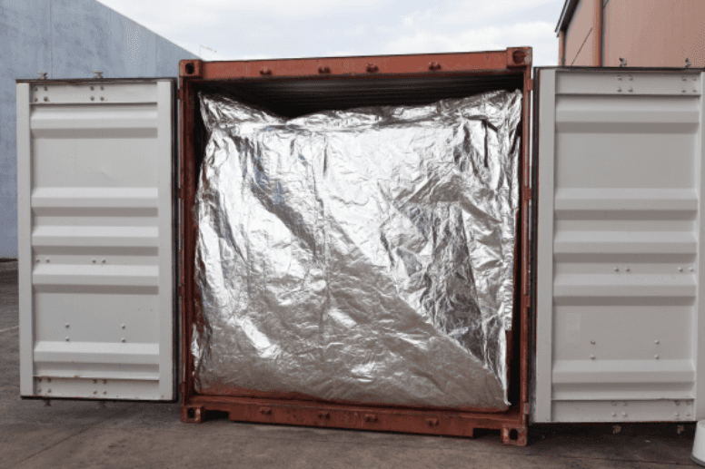 aluminum layer, polyethylene sheeting, fire retardant layer, woven polyethylene and a metalized layer. The liner can be fit to a standard 20ft or 40ft general purpose ISO shipping container and can be loaded via forklift by hand or slip sheet. Once loaded and fully sealed, it protects all six sides of the container and provides a humidity controlled environment for the cargo within.